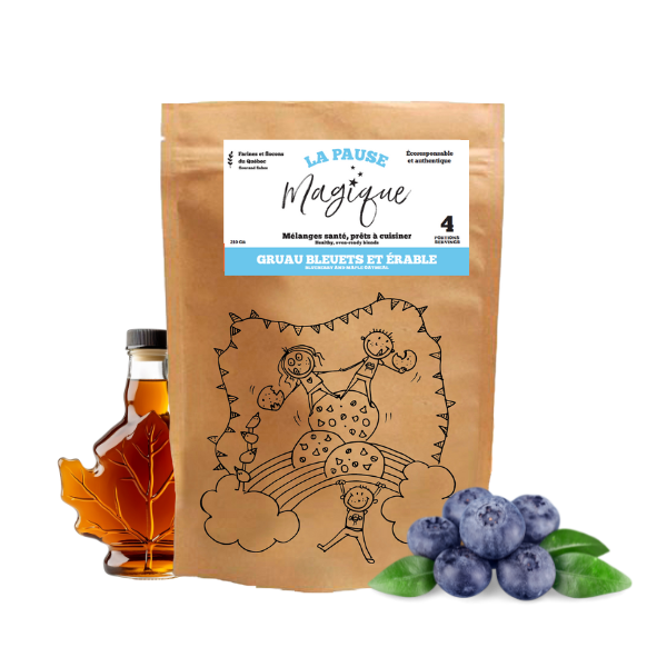 Un mélange parfait entre la douceur de l’érable et le goût délicatement fruité des bleuets ! Préparé avec de véritables flocons d’érable.