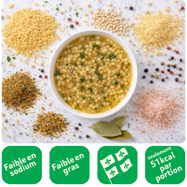 Notre soupe aux nouilles offre un bouillon savoureux et des petites pâtes tendres, prêts en quelques minutes seulement.